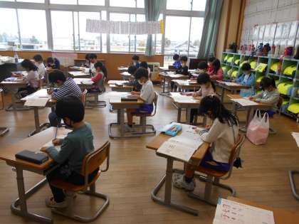 今日の書写の時間も姿勢や鉛筆の持ち方をいつも以上に意識しながら、七や子の漢字を「まがり」や「そり」に気を付けて書きました。