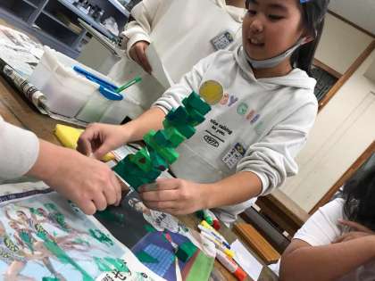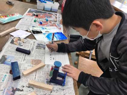 ノコギリで切った木材から発想を広げて作品を作りました。