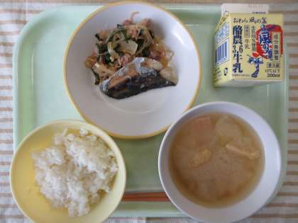 今日の献立は、ごはん、さわらの塩焼き、したらきのピリ辛炒め、白玉汁、パイナップル、牛乳です。