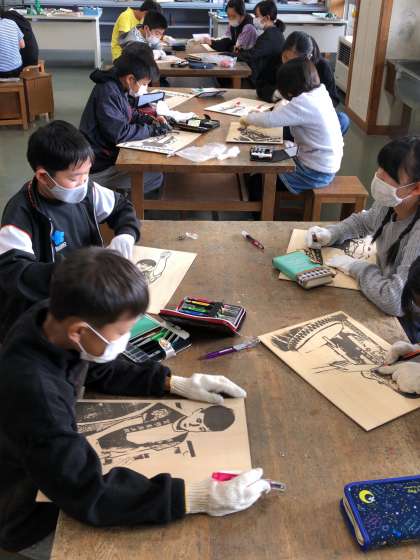 今日から彫刻刀を使った学習を始めました。学習発表会でがんばっていた子供たちの姿を版画で表現します。仕上がりが楽しみです。