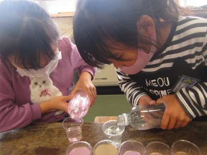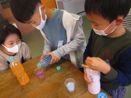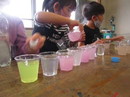 絵の具で色水を作りました。カップに入れて、できた色水を楽しみました。「きれいな色ができたよ!」「これはリンゴジュースみたい!」「うすいピンクと濃いピンクができたよ」と気付いたことをたくさん話してくれました。