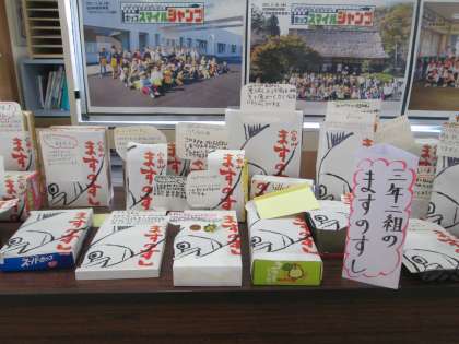 先日ますのすしの工場見学に行き、たくさんの工夫を見つけてきました。学習のまとめとして、ますのすしの宣伝シールを作りました。思いが詰まったますのすしが並びました。