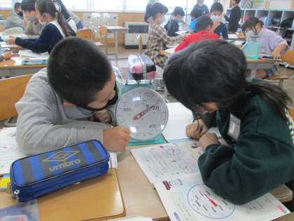 これまで天秤で重さを比べたりはかったりしてきた子供たちでしたが、はかりを使うと一回ではかることができとても便利だという声が聞こえてきました。重さをはかる前には重さの見当をつけ、予想と結果を比べていました。