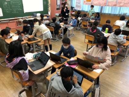 外国語の時間。各グループで、お店を開く準備をしました。準備ができたら、英語を使って買い物を楽しむ予定です。