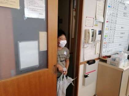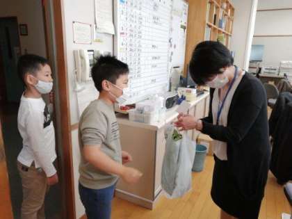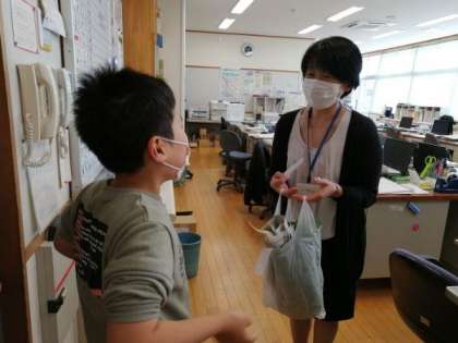 職員室に、元気なあいさつで可愛いお客様が訪ねてきました。あおぞら級の子供たちです。「校長先生、ぼくたちが育てた大根です。おいしいですよ!」日頃、お世話になっている校長先生や教頭先生に、感謝の気持ちをこめて届けに来ました。
