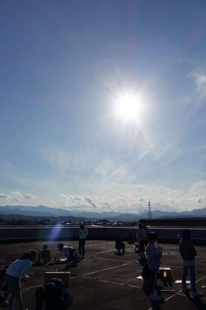 曇りや雨の日が続き、なかなかできていなかった実験がようやくできました。「鏡の枚数をもっと増やしたら、もっと温度が上がるかも知れない。」という子供たちは、鏡の数を予定より増やして実験しました。驚きの結果に、うれしそうな子供たちでした。