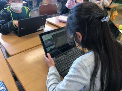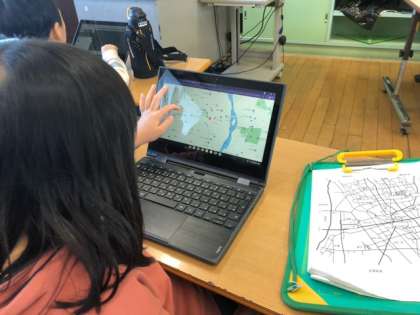 インタビューの内容を決めたり、クロームブックを活用して道順を確認したりしました。
