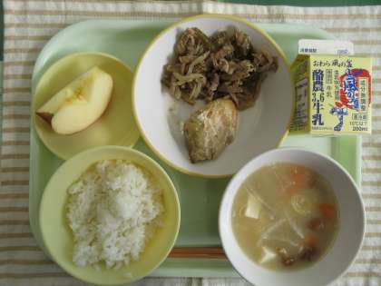 今日の献立は、ご飯、さばの塩焼き、茎わかめのきんぴら、なめこのみそ汁、りんご、牛乳です。