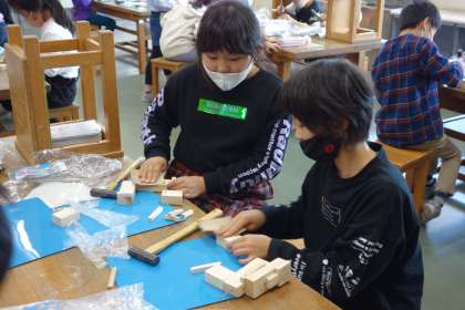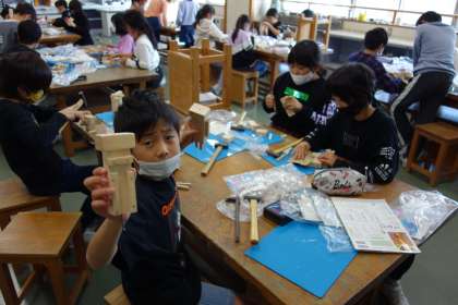 くぎ打ちの作品が仕上がってきました。最後の細かい部分を修正したり、紙やすりで磨いたりしました。初めてのくぎ打ちでしたが、げんのうを器用に扱い、イメージしたことを形にしていました。