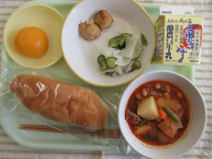 今日の献立は、米粉コッペパン、ポークビーンズ、ほたての香味焼き、かぶのサラダ、もも缶、牛乳です。