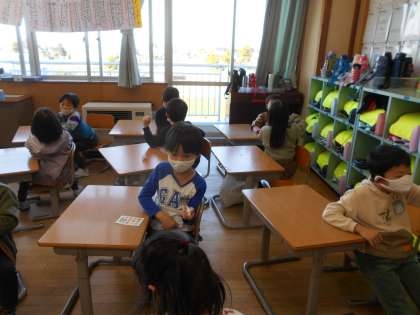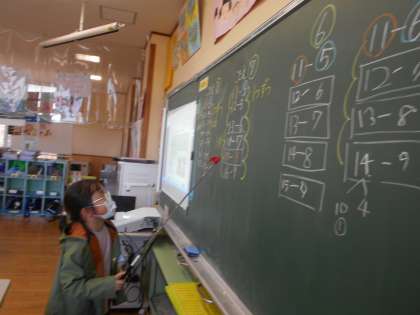計算カードについて学習しました。答えが同じ7になる11−4、12−5等の式はひかれる数が1つ増えるとひく数も1つ増えることに気付いていました。その後、ペアになって計算カードで問題を出し合いました。