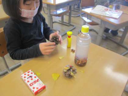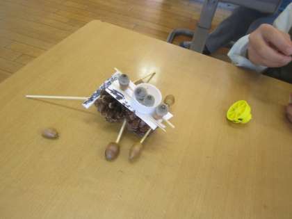 どんぐりやまつぼっくり、落ち葉などを使って、楽しいおもちゃやすてきな作品を作り上げています。「つくる」→「ためす」→「考え直す、作り直す」→「つくる」の流れで、よりよいものができあがるように頑張っています。