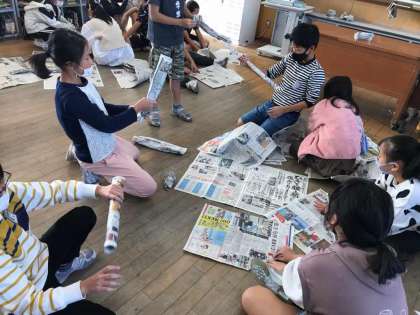 クラスの仲を深めるためにレクリエーションを行いました。今日は新聞紙タワーを作りました。