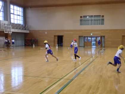 赤団はけいどろ、白団はサッカーをしました。鬼の人数を変えて何回か行ったり、女子もボールを蹴れるようにルールを決めたりと、工夫が見られました。