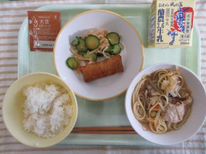 今日の献立は、ごはん、とんこつラーメン、春巻き、華風あえ、大豆ふりかけ、牛乳です。