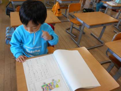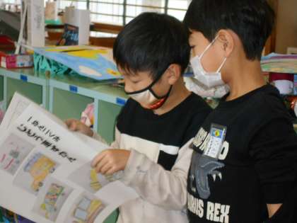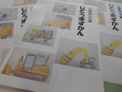 自動車比べの学習後、1年2組の自動車図鑑を作りました。自分で書きたい自動車を選んで、この車の仕事は何かな、そのためのつくりは何かなと考えながら仕上げました。早速、休み時間に読んでいる姿が見られました。