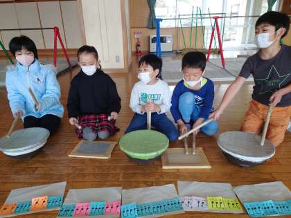 太鼓を使った学習をしています。班ごとに発表に向けて練習をがんばっています。