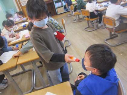 国語科「きいてしらせよう」の学習で、友達に「いまい、いちばん たのしいこと」をインタビューしました。(のりをマイクに見立て、気分はニュースのリポーターです!)「どうしてですか?」「いつから始めているんですか?」など、友達の話に合った質問をし、聞いたことをメモしました。