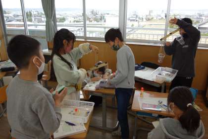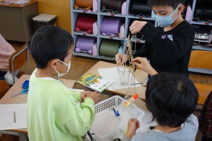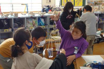 1円玉いくつ分か分かれば、その物の重さが分かります。いろいろな物を熱心に調べる子供たちです。
