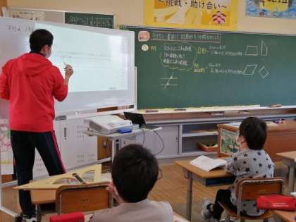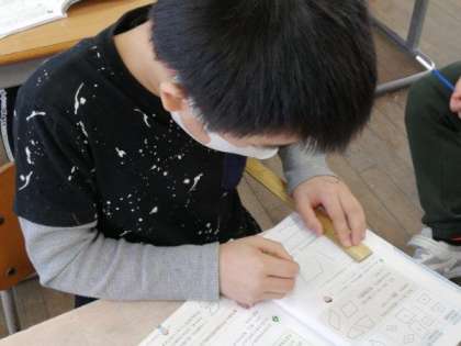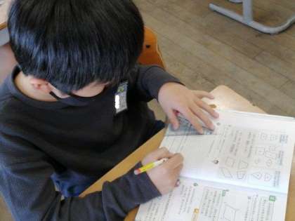 算数科の学習で、平行四辺形や台形の学習を行っています。今日は、平行な2本の直線を利用して、台形を描きました。「かんたんだね!」と子供たち。