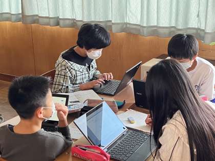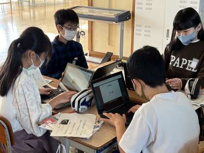 外国語科の学習では、自分でオリジナルカレーライスを考え、英語で紹介します。今日は、紹介するためのプレゼン資料をChromebookを使って作成しました。