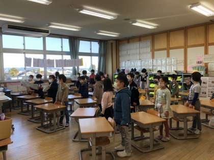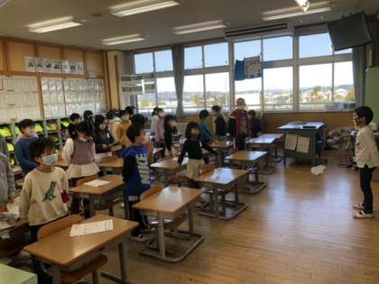 ひんやりとした朝を迎えました。空は青空、気持ちのよいお天気です。登校した子供たちは、朝の歌「ビリーブ」をマスクをしながらもしっかりと歌っています。