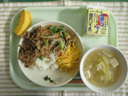 今日の献立は、ごはん、ビビンバ、みそ汁、バナナ、牛乳です。