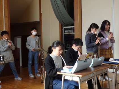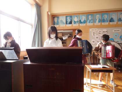 音楽の時間に、今までグループごとに練習していた「キリマンジャロ」の合奏の発表を行いました。振り返りでは、互いのグループに対して、曲想のちがいを生かして強弱をつけたり、楽器の重なりを工夫したりできたことを認め合いました。