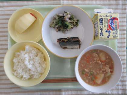 今日の献立は、ごはん、サンマの生姜味、ゆかり和え、じゃがいものそぼろあん、りんご、牛乳です。