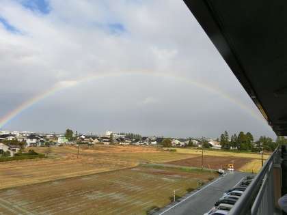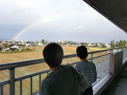 今日は朝から荒れたお天気でしたが、つかの間の晴れ間もありました。大きな虹に子供たちが気づき、思わずみんなでベランダに出て見とれていました。