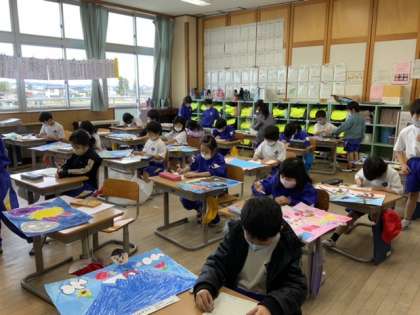 学習では、活動するだけでなく、活動を振り返って学びを実感することが大切です。図画工作科においても出来上がった子供から振り返りカードを書いています。