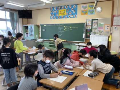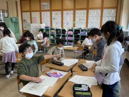 まち探検で見つけてきた「宮野のすてき」を1年生に教えてあげようと、グループで相談しました。カードには、「すてき」がたくさん書かれています。さあ、それをどんな形で伝えるか、子供たちは楽しく打合せをしています。