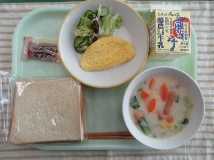 今日の献立は、食パン、クリーム煮、、オムレツ、ビーンズサラダ、メープルジャム、牛乳です。