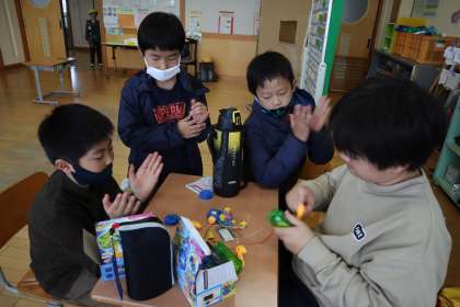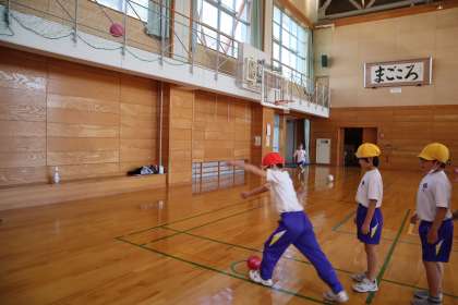 手回し発電機を活用する姿に思わず拍手!体育科では、的を狙ってキック!どの子も笑顔で学んでいました。