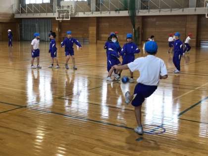 体育科の学習では、キックベースボールの練習に取り組みました。やってみると、なかなか思うようにボールを蹴ることは難しいのですが、少しずつ感覚を掴んできている子供たちです。寒さに負けず頑張っています。