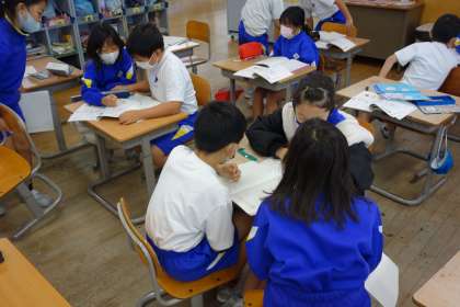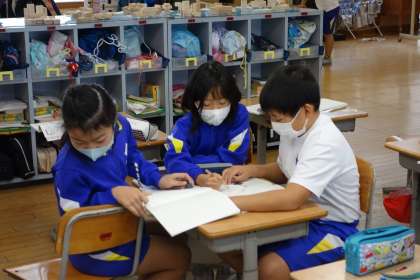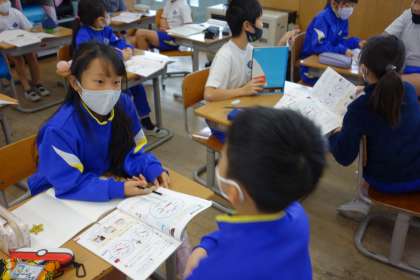 はかりの学習をしています。自分が導き出した答えや理由を伝え合っています。