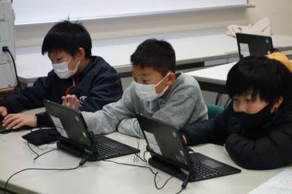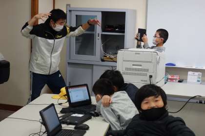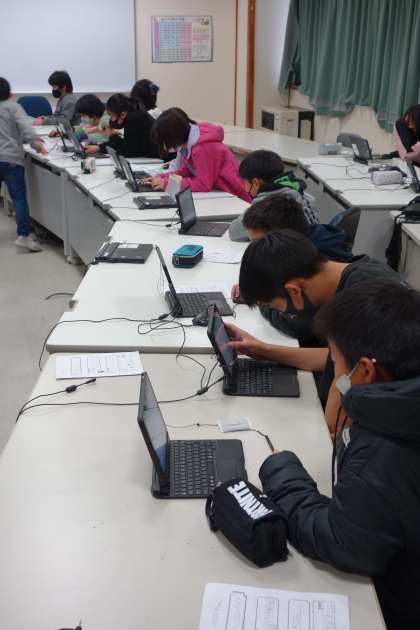 パワーポイントやカメラ機能を使って、物語作りをしています。楽しみながら作っています。
