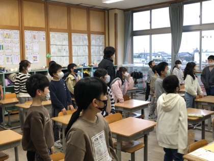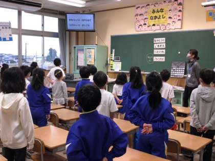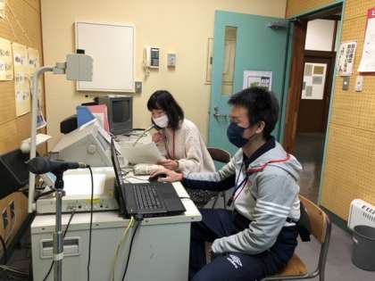 放送室からオンラインでの実施です。先生からアドバイスがあり、全校で一斉に歌いました。「ビリーブ」の歌声が全校に響き渡りました。