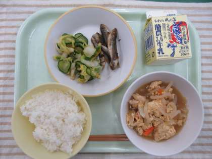今日の献立は、ごはん、親子煮、小あじの唐揚げ、白菜ひたし、牛乳です。