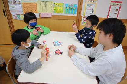 休み時間は、カードゲームやコロコロコロガーレをして遊んでいます。また、太鼓ゲンキッズでは、一生懸命練習していました。太鼓ゲンキッズ活動が終わった後も、教室で自主練習していました。