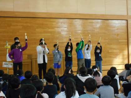 第6回授賞式がありました。今回は、1年生の受賞がありました。1組は、家庭学習チャレンジ習慣トライアングル賞をいただきました。これは、家庭学習週間で宮野っ子検定、自分の目当て、目標時間のすべてが達成できた人が90パーセントのクラスに贈られます。2組も次回は授賞できるようにがんばります。