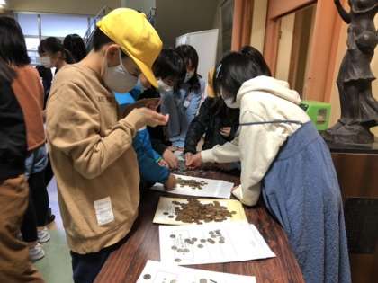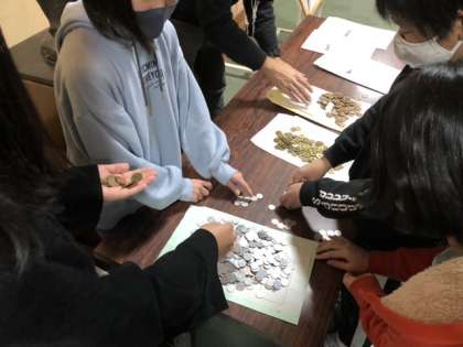 ボランティア委員会の子供たちが、集まった募金の仕分けをしています。小さな積み重ねが大きな力になっていきます。