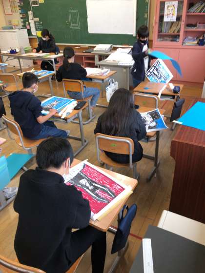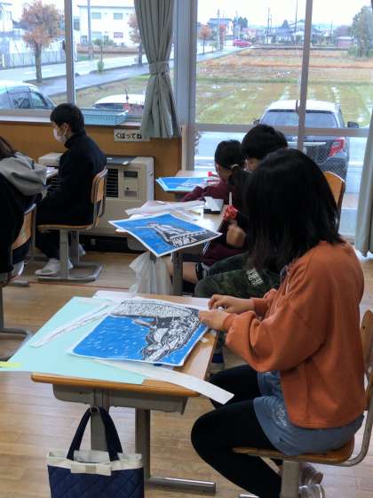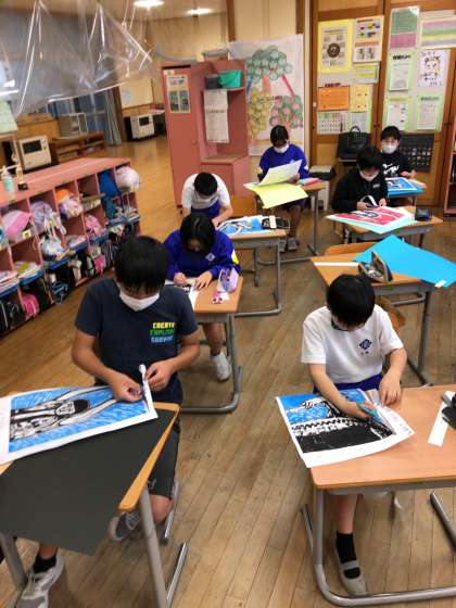 版画を刷り終えた5年生は、作品の1cmほど外側を丁寧に切り取り、台紙に貼って完成させましたた。完成した作品は、個別懇談会の際にご覧ください。