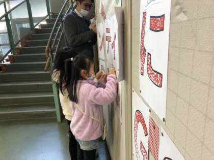 今朝もシールを貼っている姿が。どの文字もシールでいっぱいになってきています。
