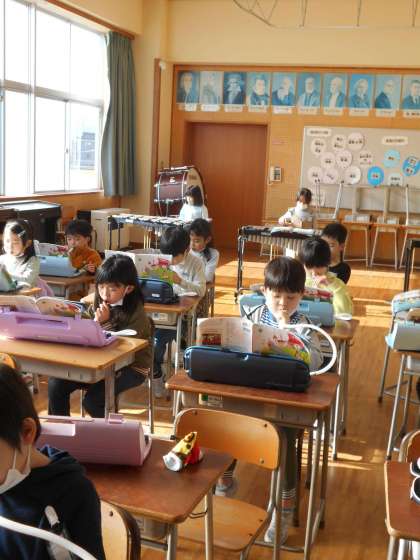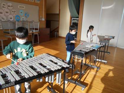 鉄琴、木琴の演奏の仕方を学習しました。初めて、鉄琴や木琴に触れるという子供たちも多く、これからもいろんな楽器を演奏する機会をもちたいと思いました。