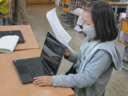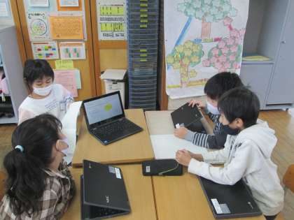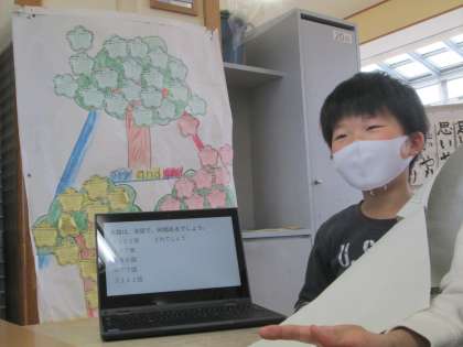 総合的な学習で一人ひとり調べたいテーマを選び、分かったことをスライドにまとめて発表しました。クイズも取り入れ、友達に分かりやすいように伝えていました。