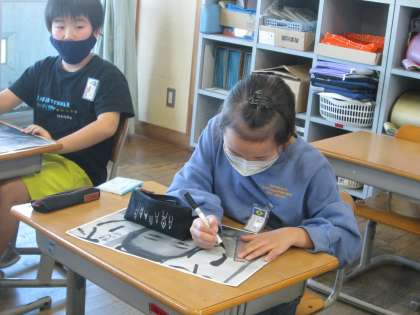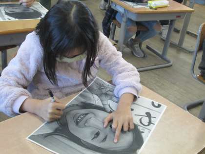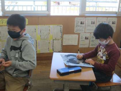 3学期に行う版画の下書きに取り組んでいます。自分の顔や手はどんなふうになっているのか、マジックで書きながら確かめました。
