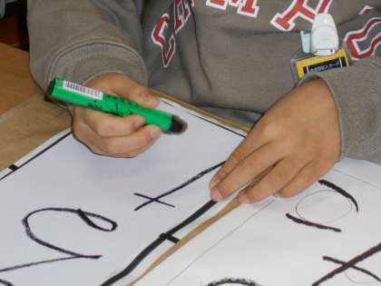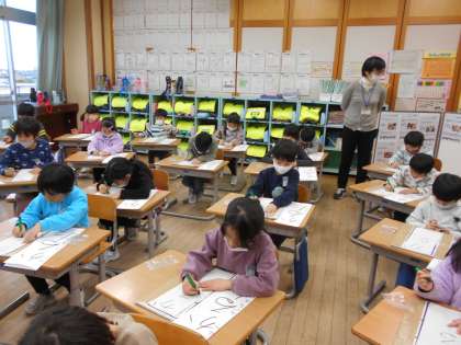 硬筆墨を使って「かるた」の文字を書きました。3学期の始業式に書初大会が予定されています。初めての体験ですが、集中して練習しました。これからも練習していきたいと思います。
