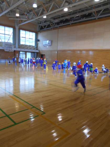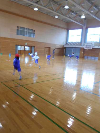 今回はお手玉交換リレーをしました。お手玉の色を輪の中で交換するだけなのに、楽しめました。お手玉を交換する方法をいかに素早くするのかを考えました。