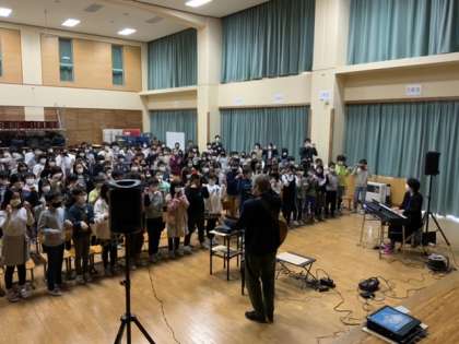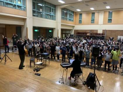 公演IIでは上学年の子供たちが鑑賞しました。まず一緒に歌いました。気分がノッてきています。